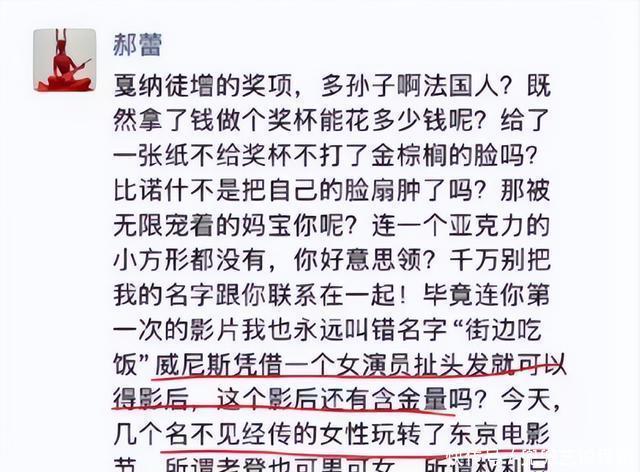 郝蕾敢吼,是因为她早就不靠奖杯吃饭。新加坡电影节请她当评委,她嫌酒店自助餐难吃,直接自己掏钱搬去大排档边民宿;丝绸之路电影节,她给一部零票房纪录片投最佳影片,把主办方吓到连夜改规则——“评委长片必须票房过百万”。她说“红了全对,不红是原罪”,翻译成人话:奖是王冠,也是遮羞布,遮的是真金白银的屁股。——当评委都敢掀桌,难怪敢怼天怼地。