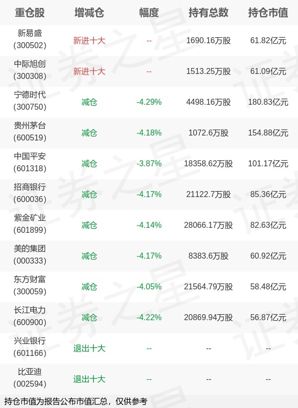 本站消息,10月28日华泰柏瑞基金旗下柳军管理的华泰柏瑞沪深300交易型开放式指数基金公布三季报,近1年净值增长率22.17%。与上一季度相比,该基金前十大重仓股新增新易盛,中际旭创;其中宁德时代持仓占比4.25%,为该基金第一大重仓股;兴业银行易启胜,比亚迪等退出前十大重仓股;详细数据如下: